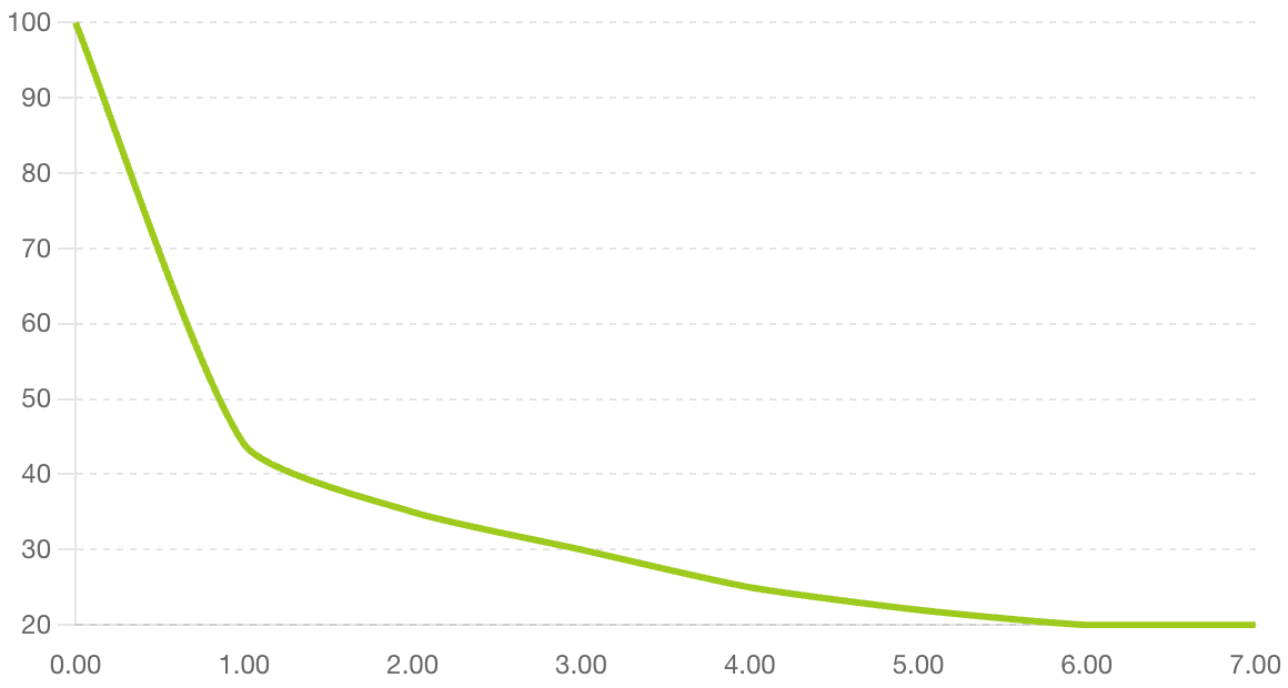 Кривая забывания по Эббингаузу. Ось Y — процент сохранённой информации / Ось X — время после изучения (часы)
