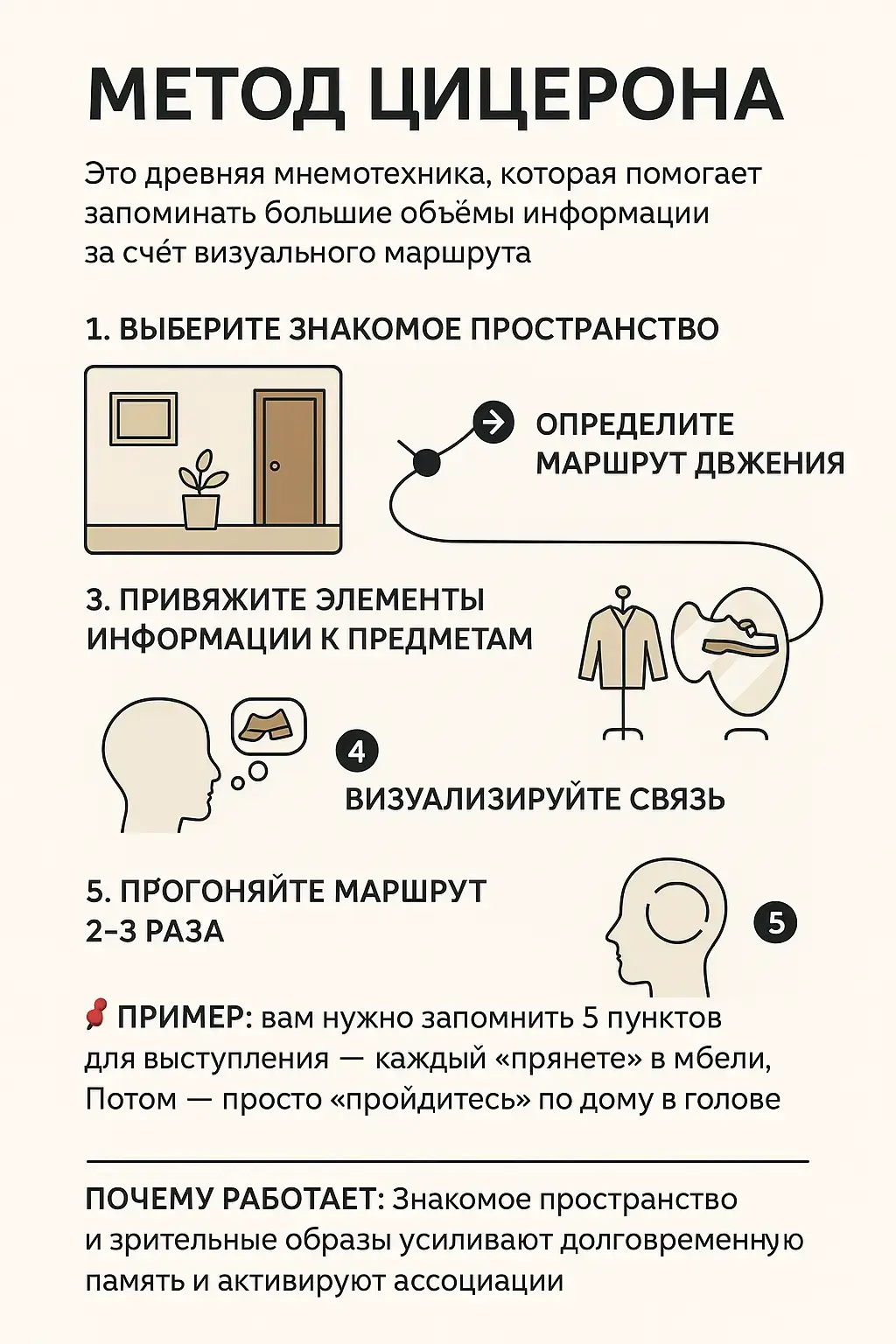 📌 Пример: вам нужно запомнить 5 пунктов для выступления — каждый «прячете» в мебели. Потом — просто «пройдитесь» по дому в голове.